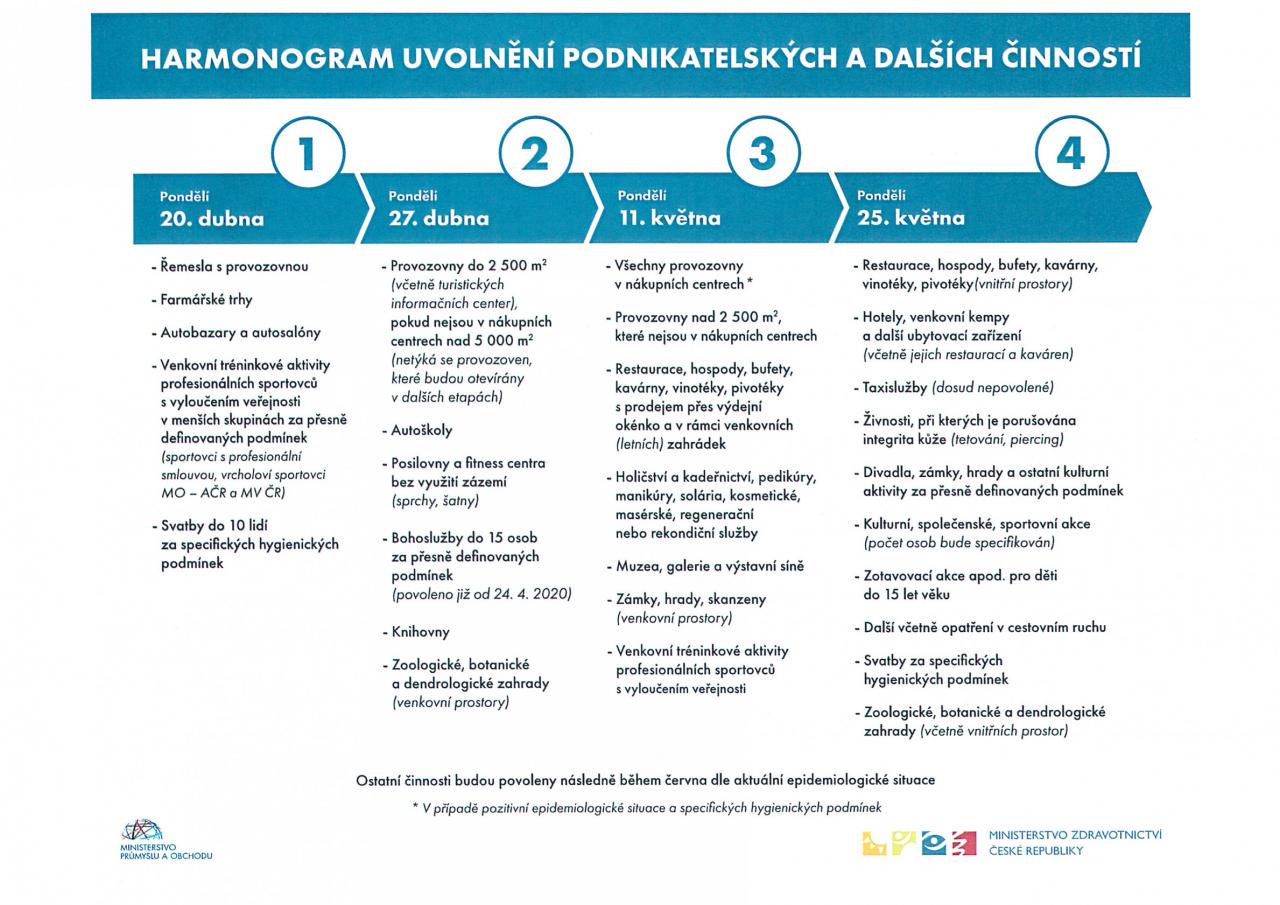 Vláda na svém zasedání ve čtvrtek 23. 4. 2020 rozhodla o urychlení uvolňování vybraných opatření. Časový harmonogram níže byl aktualizován a je platný k 23. 4.