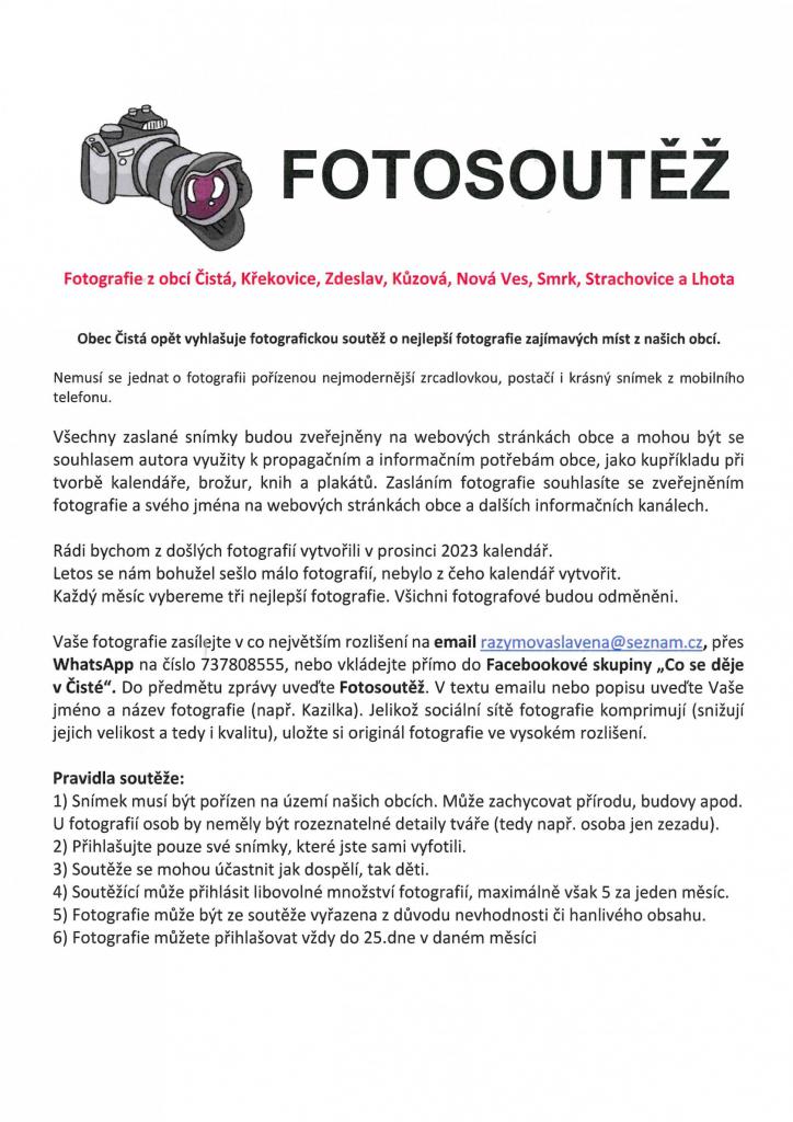 Obec Čistá opět vyhlašuje fotografickou soutěž o nejlepší fotografie zajímavých míst z našich obcí.